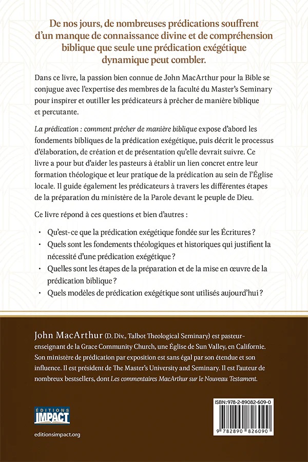 Ce livre est un guide essentiel pour les prédicateurs désireux de prêcher fidèlement la Parole de Dieu. Il insiste sur l’importance de la prédication exégétique : une prédication enracinée dans une compréhension profonde et précise des Écritures.