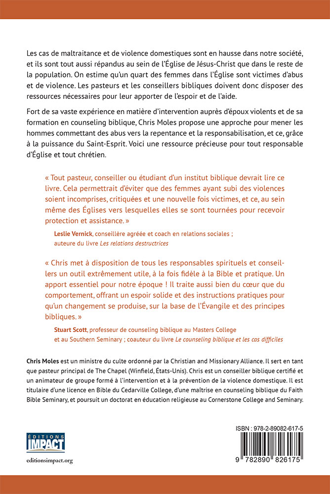 Fort de sa vaste expérience dans l’accompagnement d’hommes violents et de sa formation en counseling biblique, Chris Moles propose une approche visant à conduire les auteurs de violences vers la repentance et la responsabilisation, grâce à la puissance du Saint-Esprit.