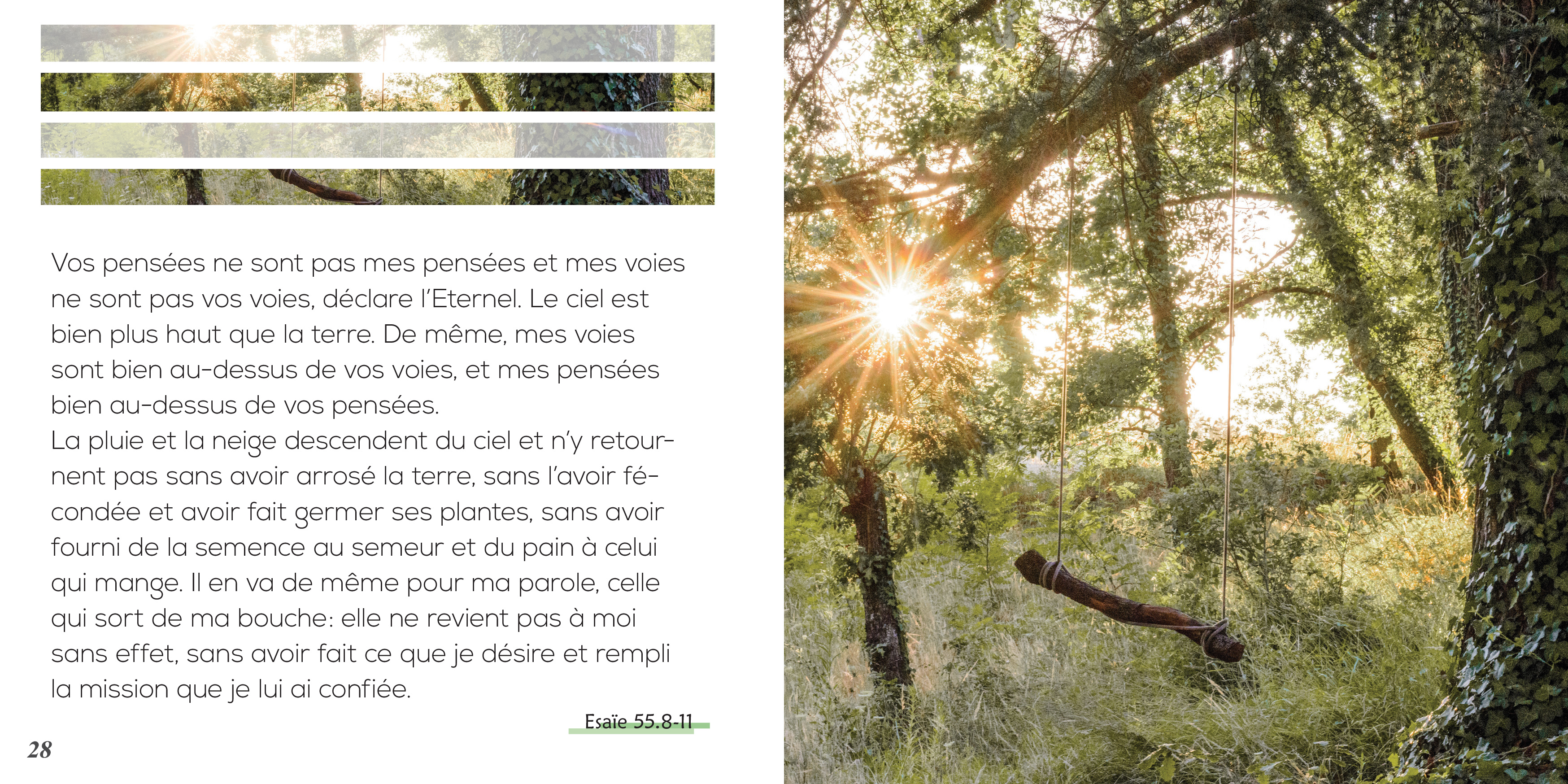 Les collaborateurs et partenaires de la Société Biblique de Genève - La Maison de la Bible ont été invités à communiquer les leurs, et les voici réunis dans ce recueil, associés aux photographies de chasseurs d’images amateurs de talent (Aurélien Lévy, Cédric André, Catherine Roca).