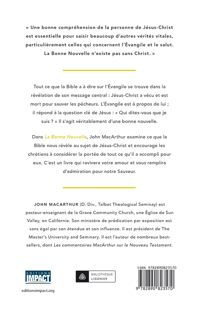 Par ce livre, John MacArthur souhaite définir comment la bonne nouvelle de l’Evangile est exprimée en la personne de Jésus-Christ. Tous les aspects qui font du fils de Dieu le digne guide du chrétien sont ici explorés.