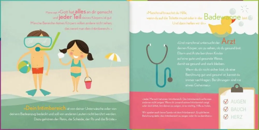 Durch eine behutsame Sprache und ansprechende Illustrationen ermöglicht das Buch Eltern, mit den eigenen Kindern über die sensiblen Körperzonen zu sprechen, ohne dabei ungesunde Scham und Unsicherheit zu provozieren. Ausgehend von der Wahrheit, dass Gott alles gut geschaffen hat, lernen die Kinder ihren Körper wertzuschätzen und dabei angemessene von unangemessenen Berührungen zu unterscheiden. Das Buch wird dadurch zu einem grossartigen Hilfsmittel, um Kinder vor sexuellem Missbrauch zu schützen.