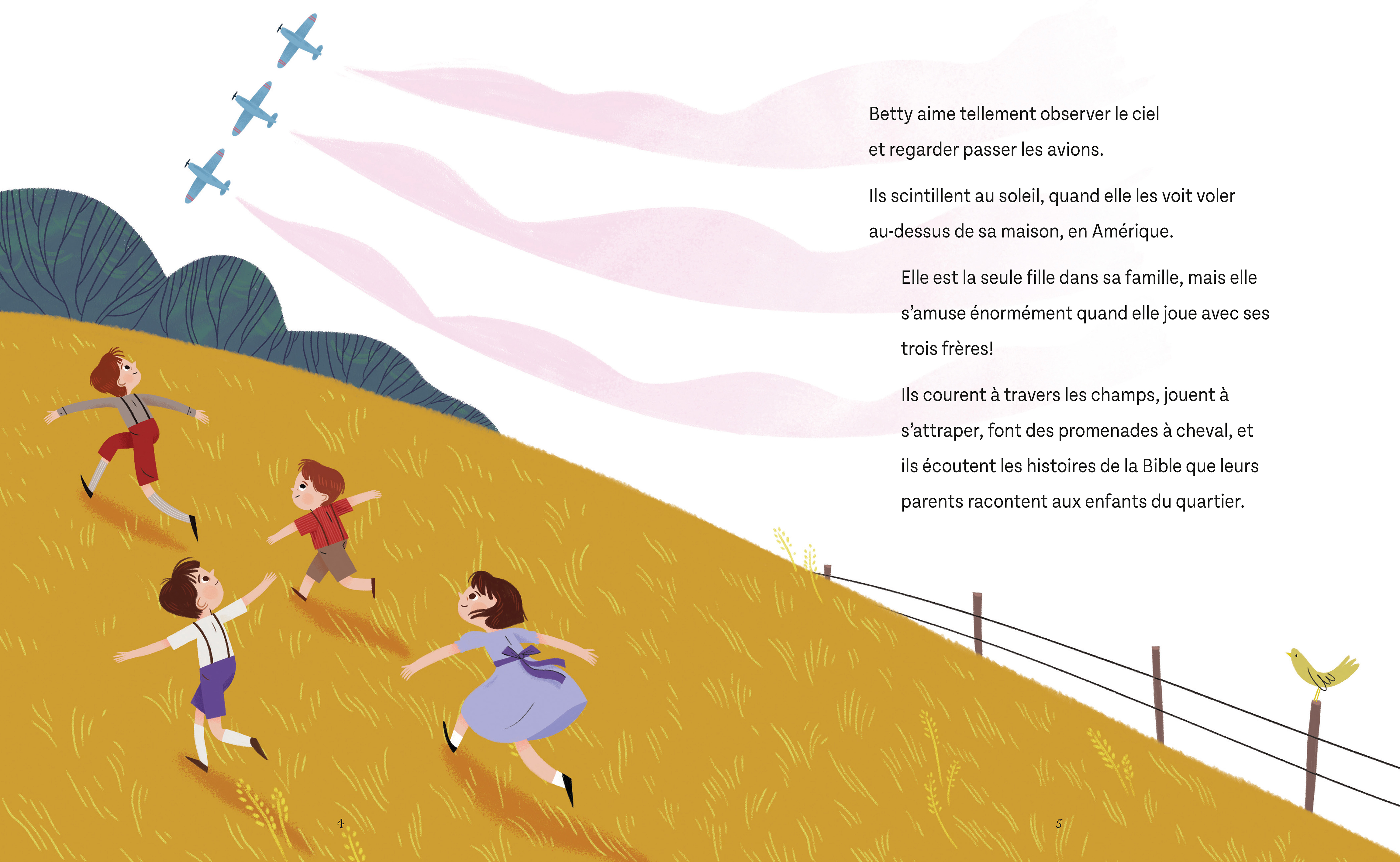 Betty est la seule fille de sa famille, mais elle aime beaucoup s’amuser avec ses trois frères. Ce qu’elle aime aussi particulièrement, c’est observer le ciel et regarder les avions passer au-dessus de leur maison. Un jour, son frère aîné commence à prendre des cours de pilotage. Et cela lui fait tellement envie ! Seulement, elle a si peu d’argent, et cela coûte très cher… Comment son rêve va-t-il pouvoir devenir réalité ?