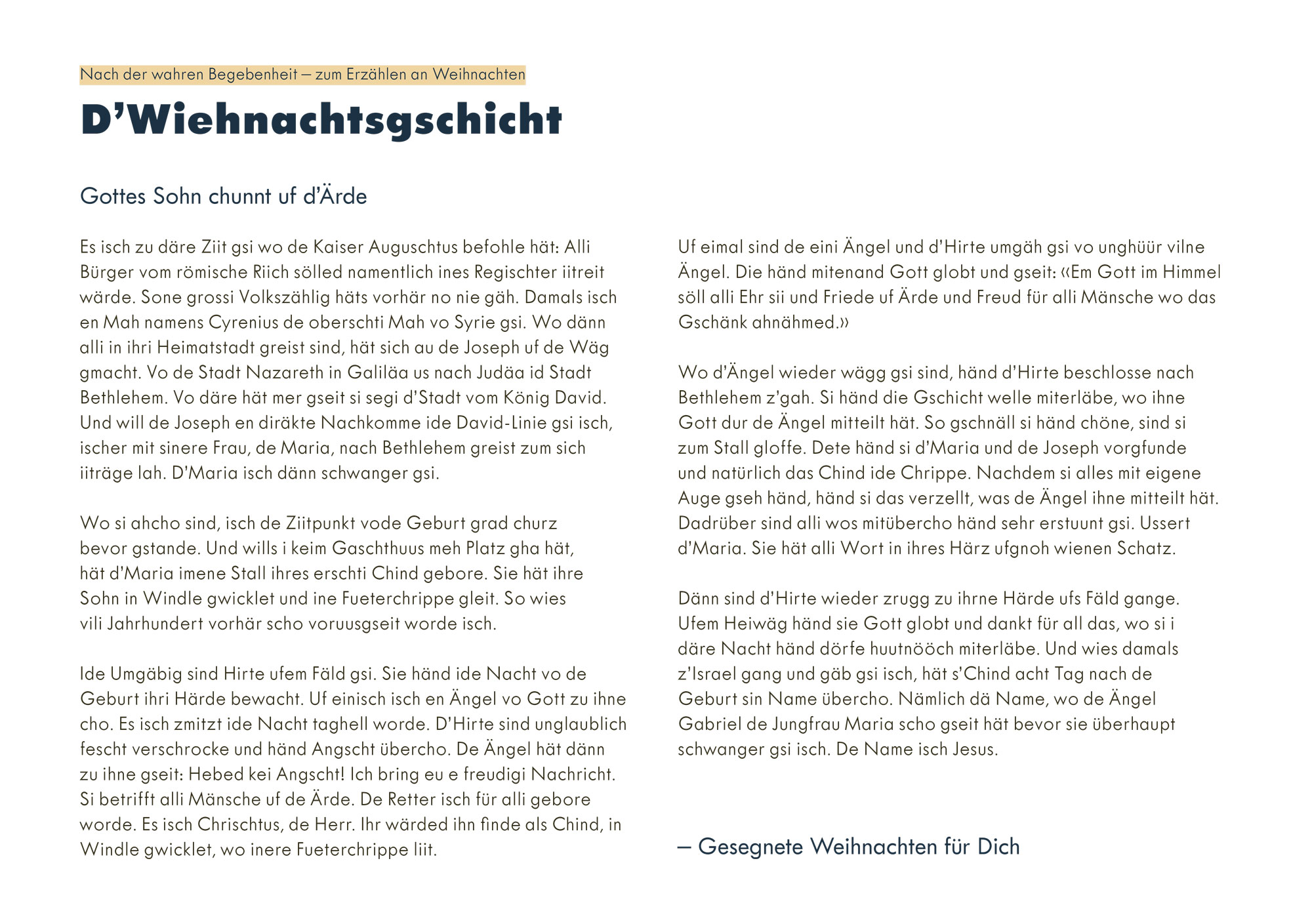 «D'Wiehnachtsgschicht für Dich» Faltkarte mit der Weihnachtsgeschichte in Mundart