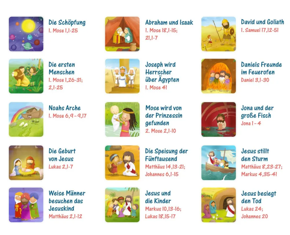Gedächtnisspiele verbessern die Konzentration, Detailgenauigkeit, das Kurzzeitgedächtnis und vieles mehr. Darüber hinaus bringt Bibel-Memo den Kindern einige der bekanntesten biblischen Geschichten nahe und weckt ihr Interesse, noch mehr zu erfahren. Wenn ein Spieler das biblische Ereignis auf einer Karte erkennt, erinnert er sich schneller an diese Karte, weil eine Geschichte dahintersteckt.